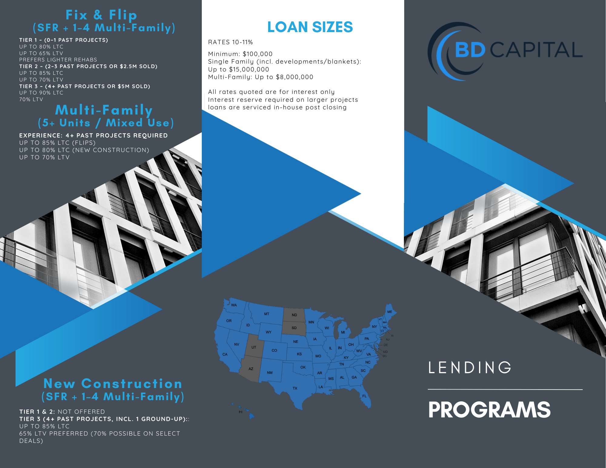 A one-page snapshot of our loan offerings, financing options, and servicing process. Download for a quick overview.